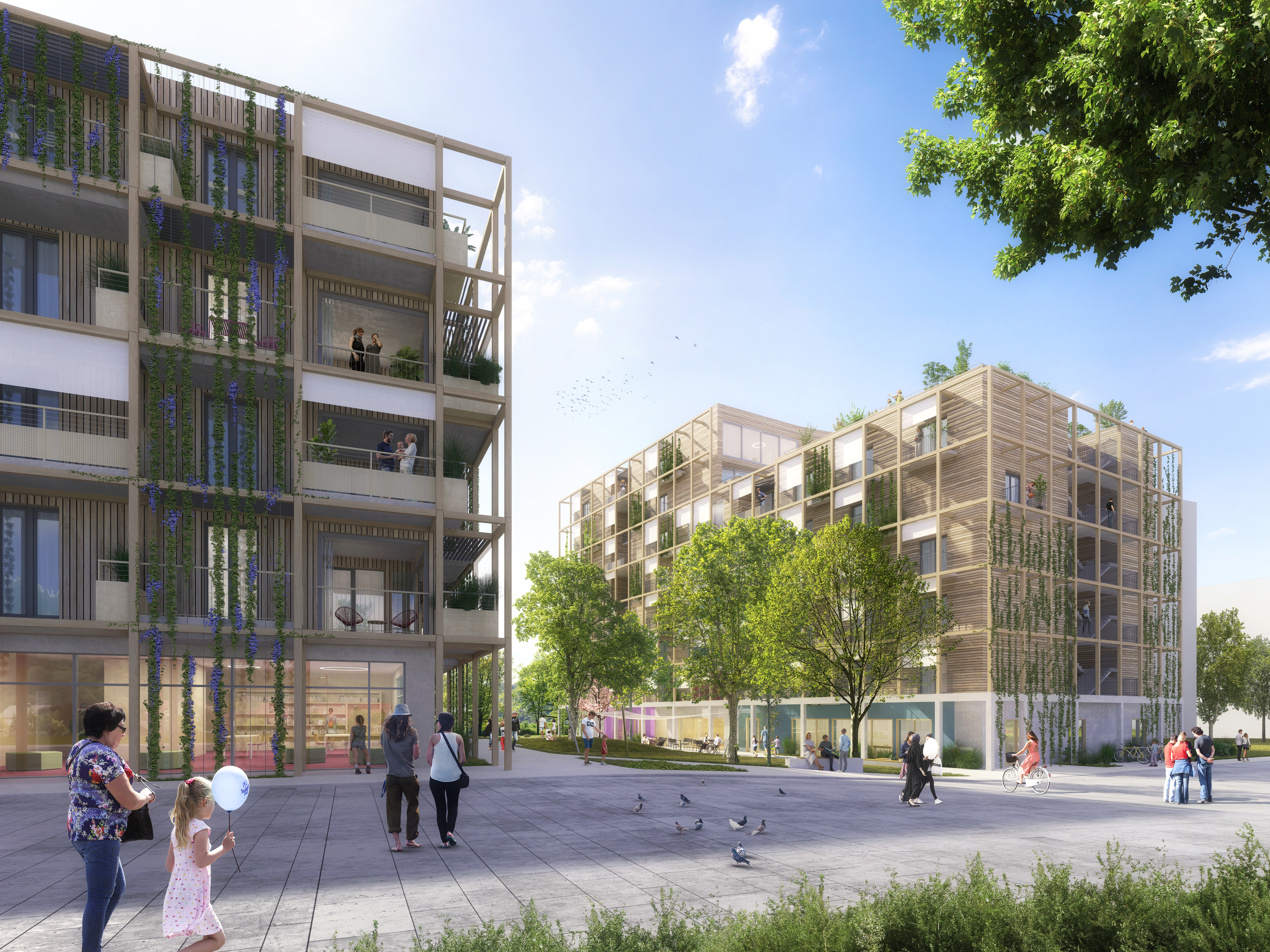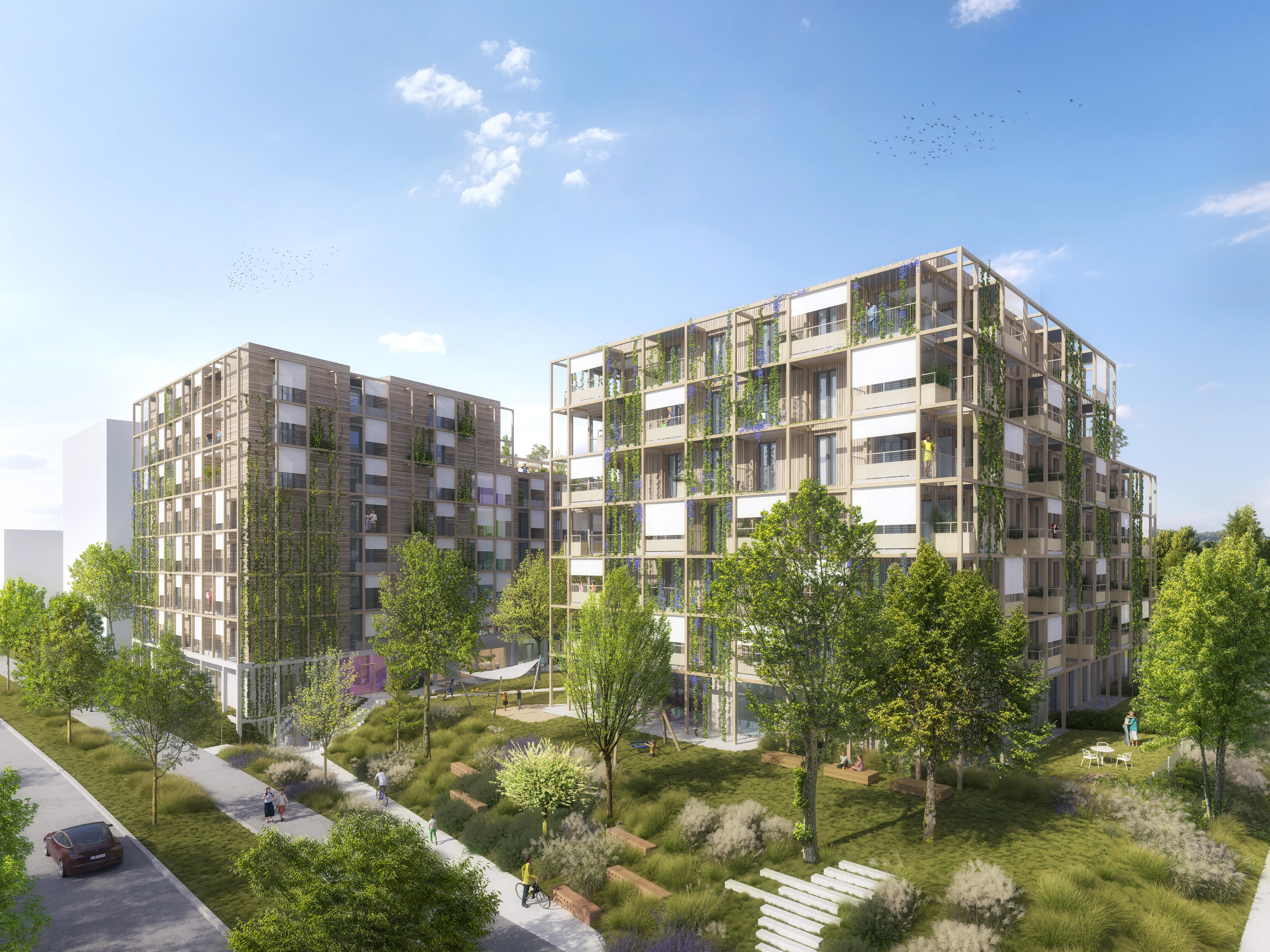 Das Wohnprojekt auf Bauplatz 5 umfasst 44 geförderte Mietwohnungen mit Superförderung, wovon 23 Wohnungen nach den SMART-Richtlinien errichtet werden. Die Wohnungen verteilen sich auf zwei kompakte sieben- und achtgeschossige Gebäude. Eine den Gebäuden vorgelagerte Regalkonstruktion umfasst Balkone und sorgt aufgrund der Begrünung für mehr Sonnenschutz. Heizung und Warmwasser werden mittels Wärmepumpen und Tiefensonden erzeugt, kombiniert mit Fernwärme. Für eine regenerative Stromerzeugung sorgt eine Photovoltaikanlage.