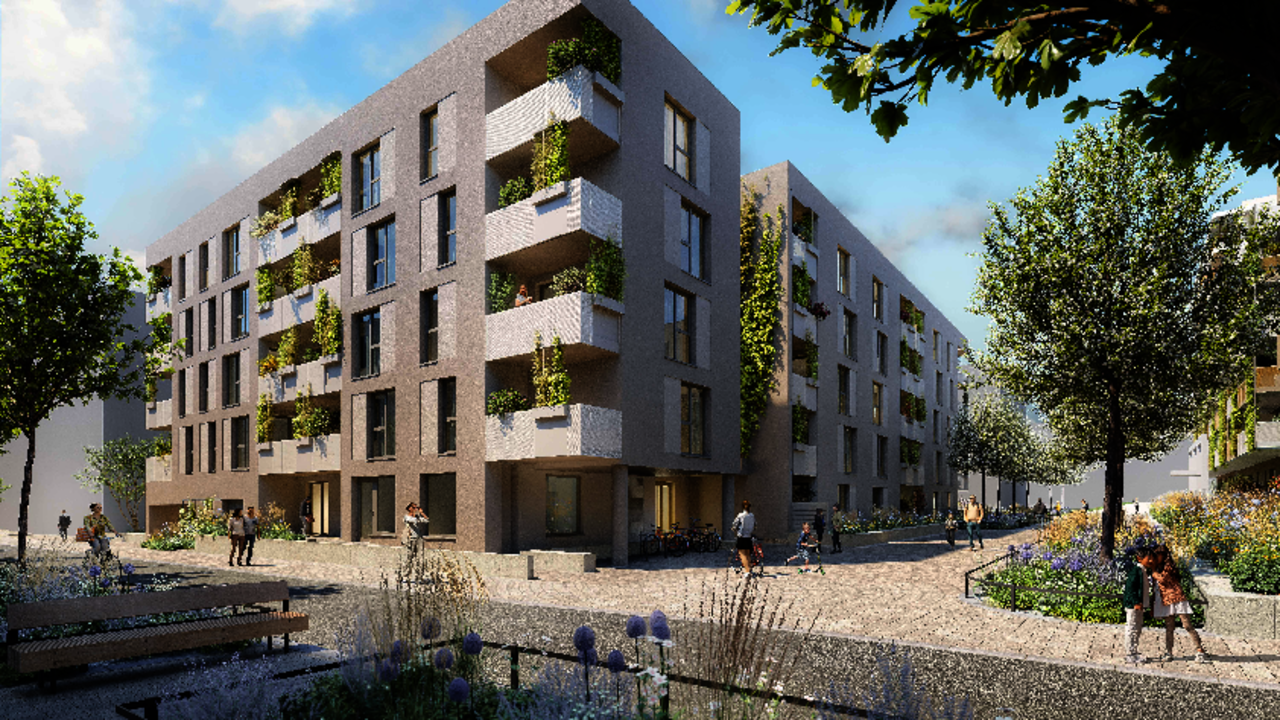 Visualisierung des Wohnprojekts Oberes Hausfeld, Bauplatz F2, Straßenansicht
